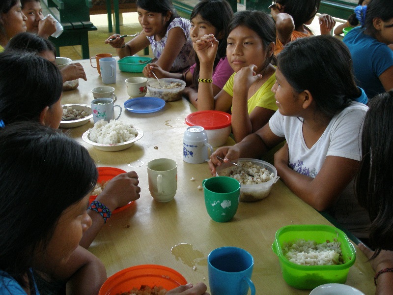 En cuanto a comida, ésta se prepara por turnos semanales sin excepción de género. Cocinan en un fogón que consume toneladas de leña. Mensualmente matan una vaca para proveerse de carne y para aumentar las proteínas han comenzado a criar pavos, gallinas y kuyes. En el colegio cogen peso, pues proceden de realidades duras: en sus casas pasan hambre.
